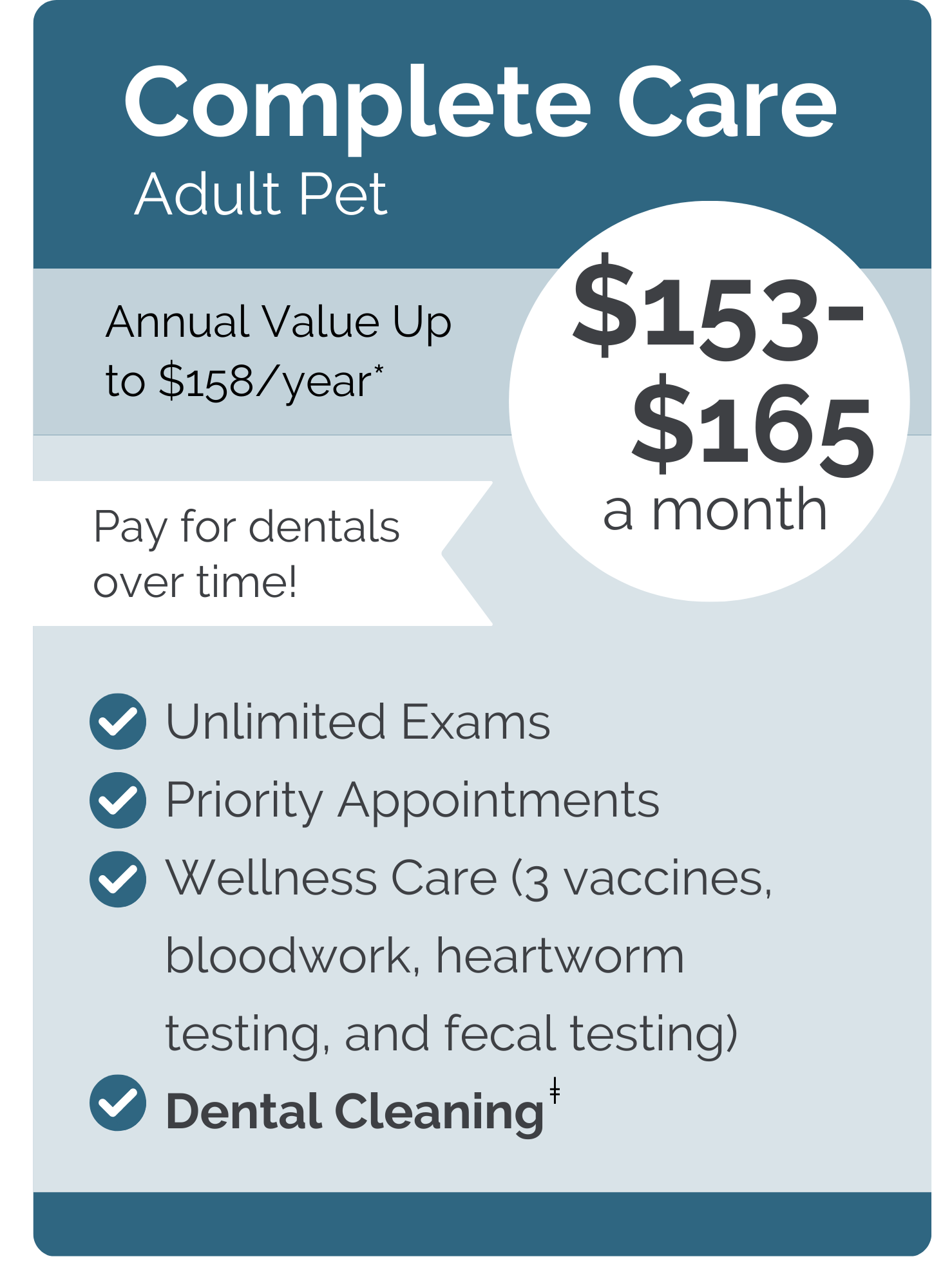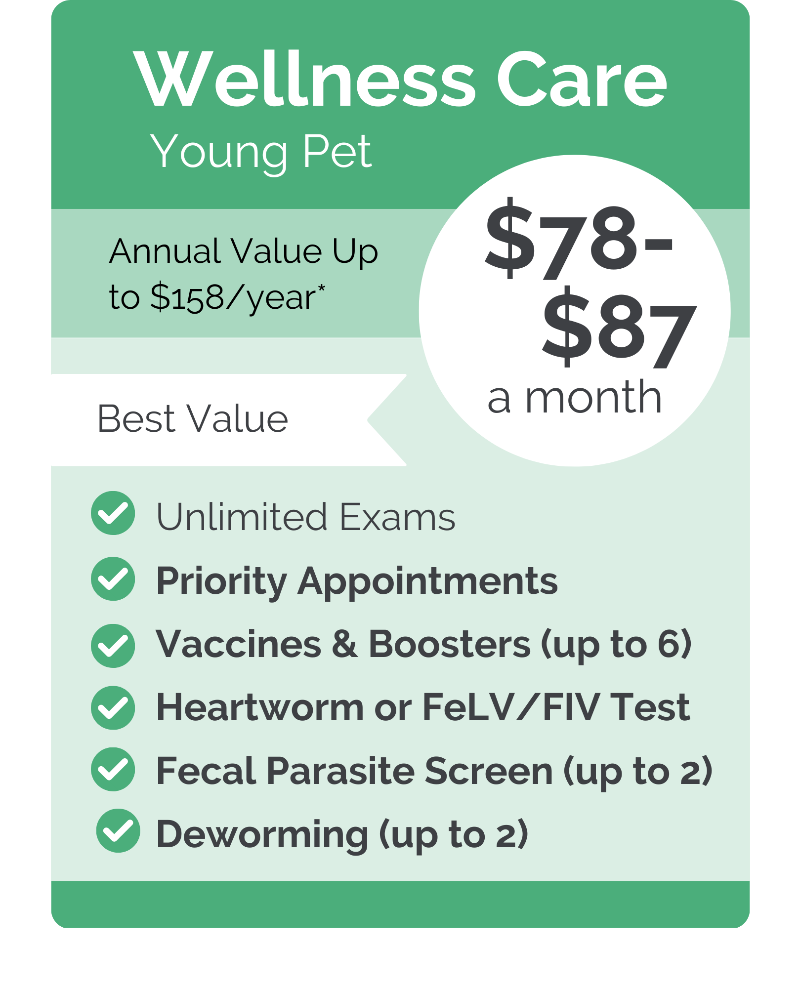 Plus, with our Wellness Care plans, you’ll enjoy priority appointments with same- or next-day scheduling whenever possible. Spread out the cost of services like dental care throughout the year, so you can give your pet the care they need without any financial stress.